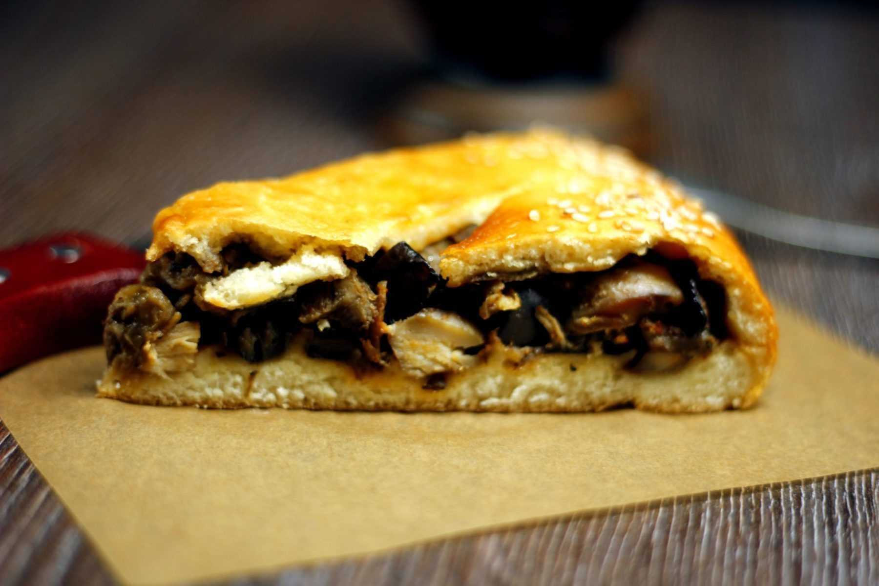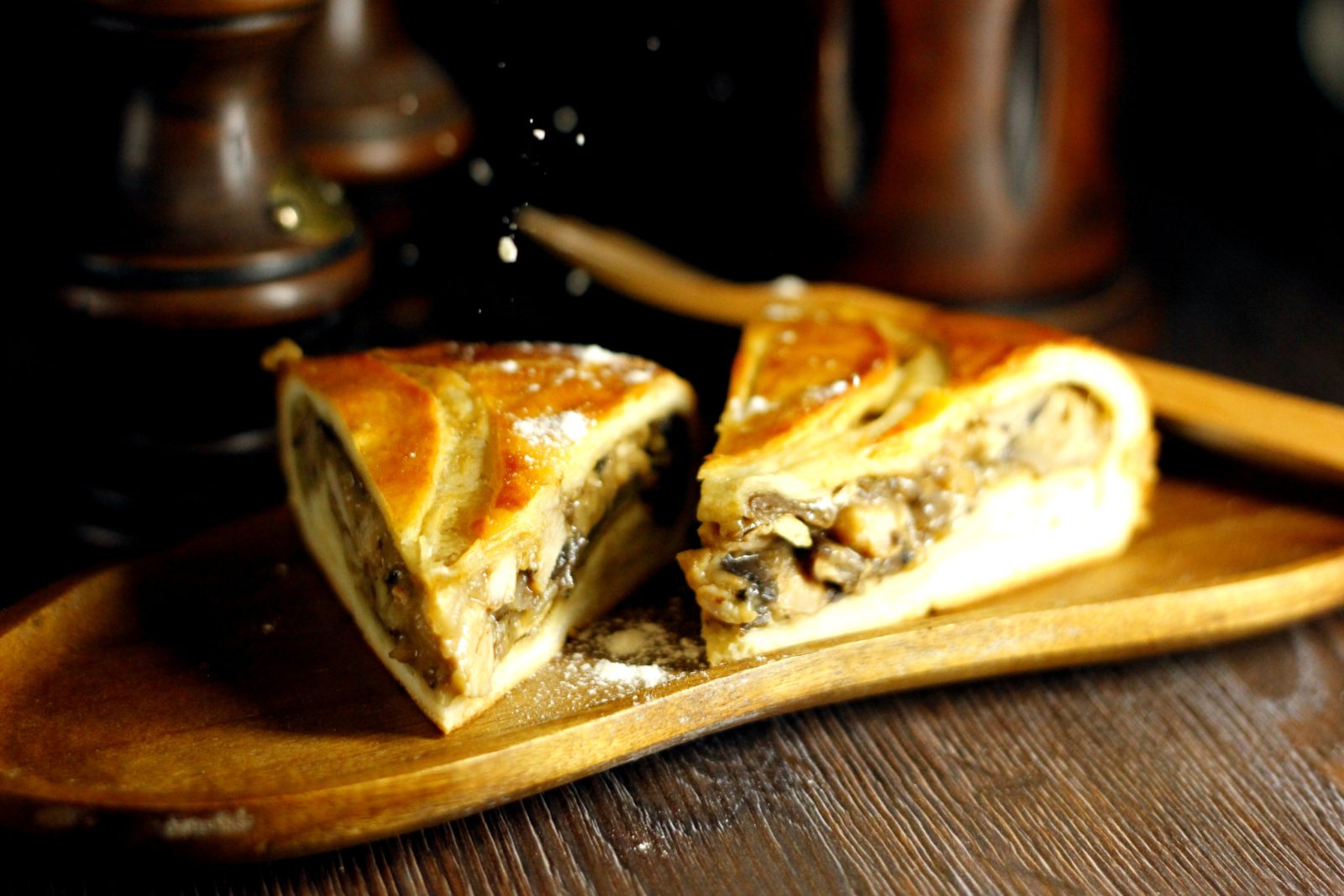 Oivaliselt lõhnav pirukas praetud puravikest, kanast ja juustust täidisega.