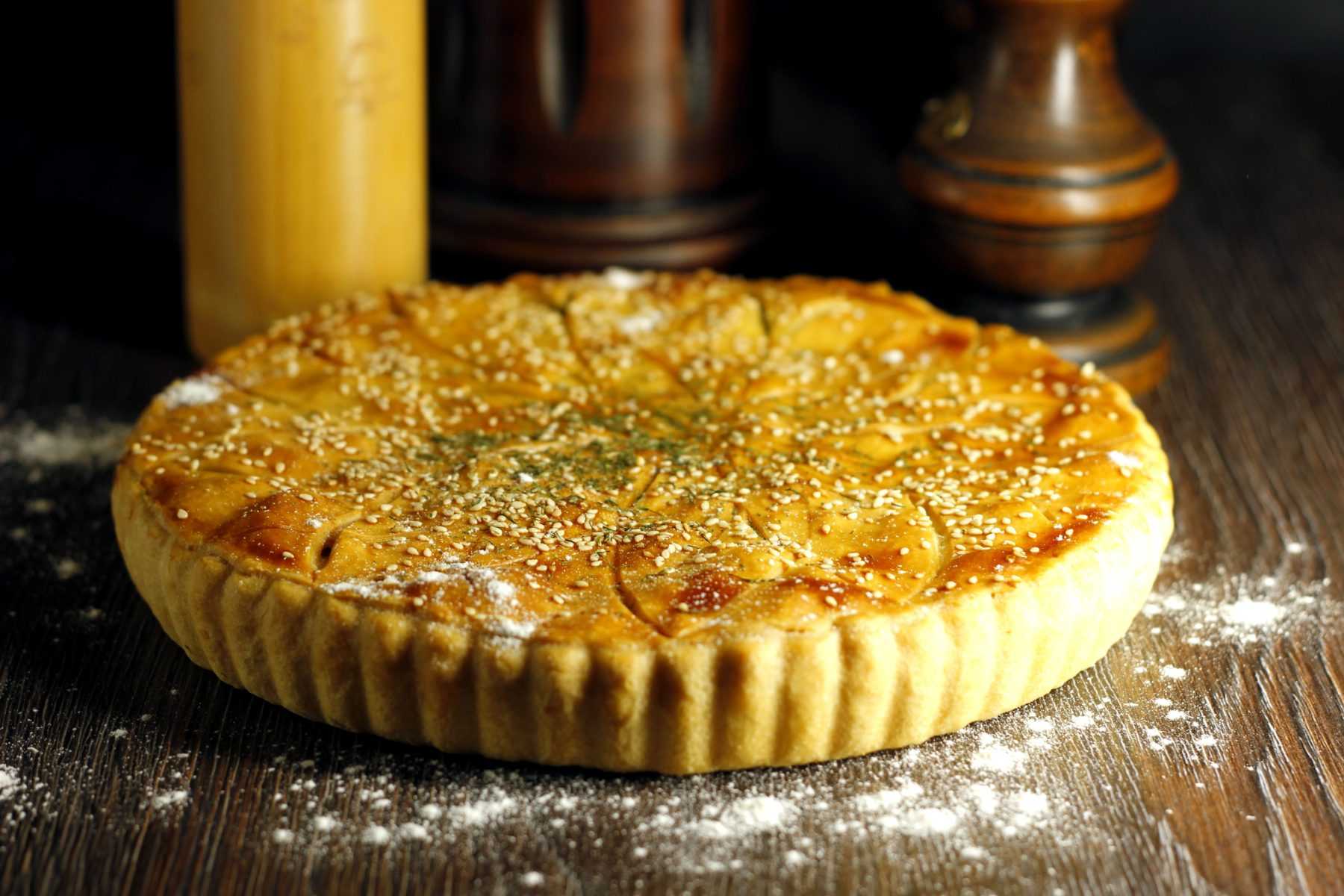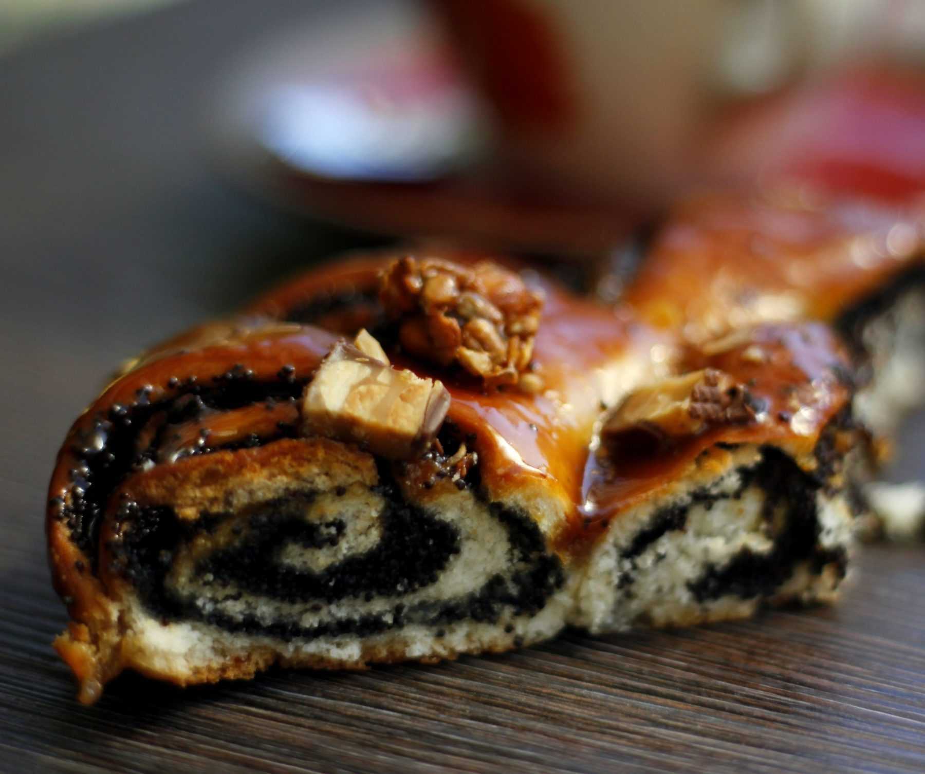 Mooniseemnete ja koorekaramelli täidisega pärmilehttaignapirukas, millele on puistatud röstitud Kreeka pähkleid