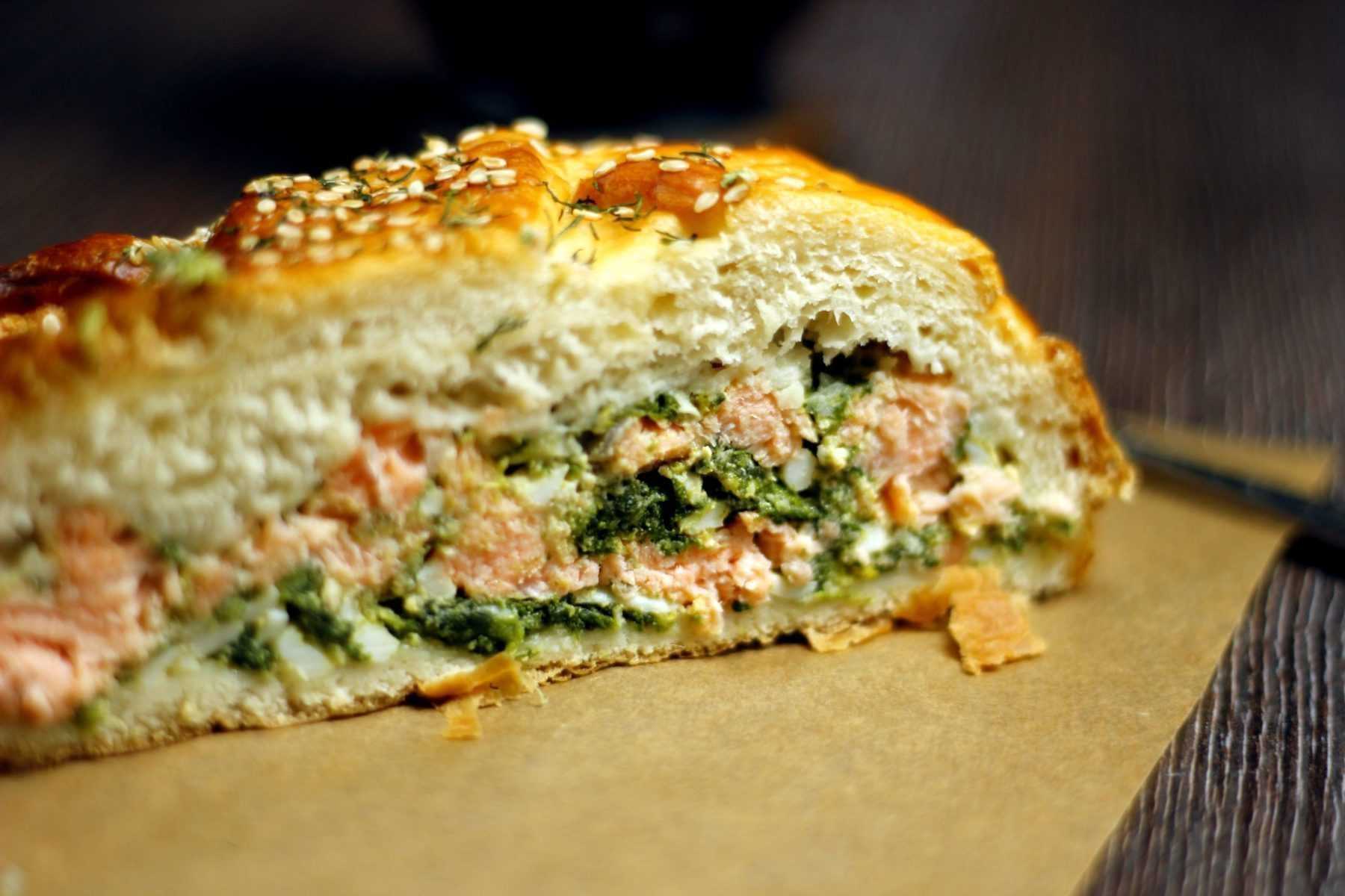 Pirukale laotatakse kiht võis hautatud kala ja värsket spinatit. Kõik koos küpsetatakse meie firmataignas – see on meie variatsioon teemal «klassikaline Vene kalapirukas»