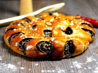 Mooniseemnete ja koorekaramelli täidisega pärmilehttaignapirukas, millele on puistatud röstitud Kreeka pähkleid